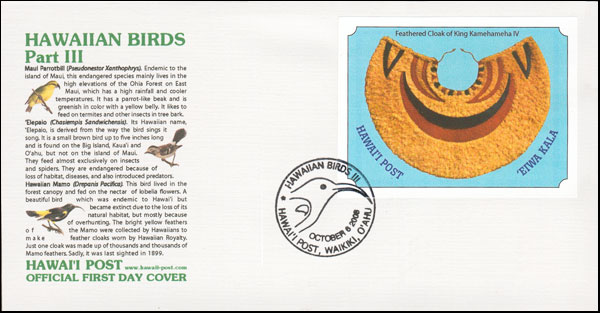 The special postmark for the above covers were issued for October 6 2008 only. The upper inner circle reads " HAWAIIAN BIRDS III." The lower inner circle reads "HAWAI'I POST, WAIKIKI, O'AHU". Above that is the date "OCTOBER 6 2008". The center shows the head of a bird. Black ink was used. To order the FDC's click here November 10 2008