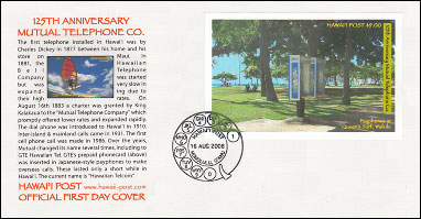 A First Day Cover was issued on August 16 2008 with a special cachet and a postmark. Covers were made in white and gray. The special cachet shows a telephone card, depicting a windsurfer, that was inserted into special Japanese-style pay phones in Hawai'i. The text gives a little history of the Mutual Telephone Company in Hawai'i.